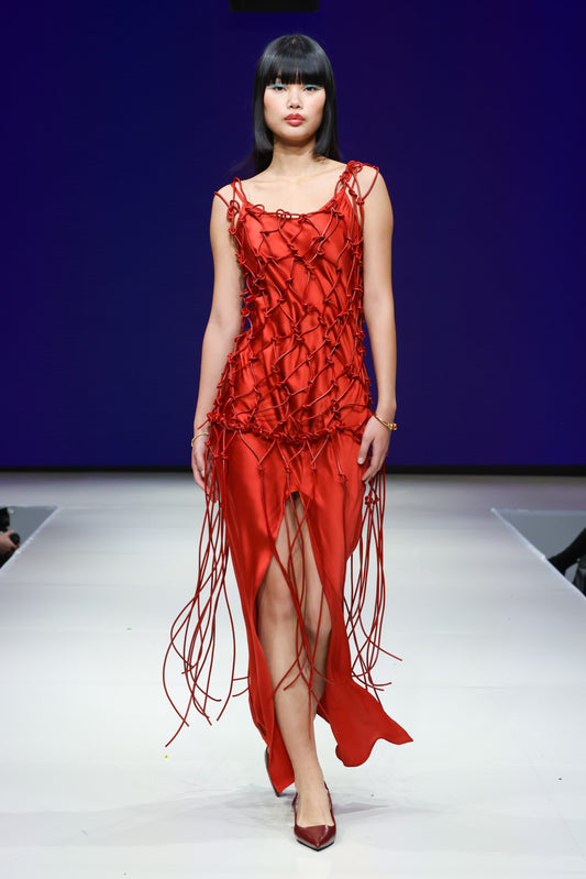 MACRAME LEATHER DRESS / SAFFRON RED
