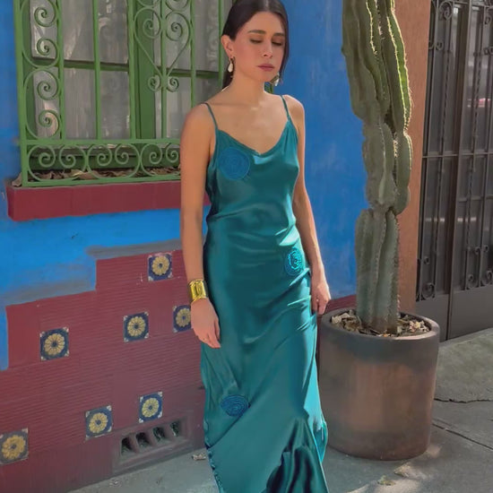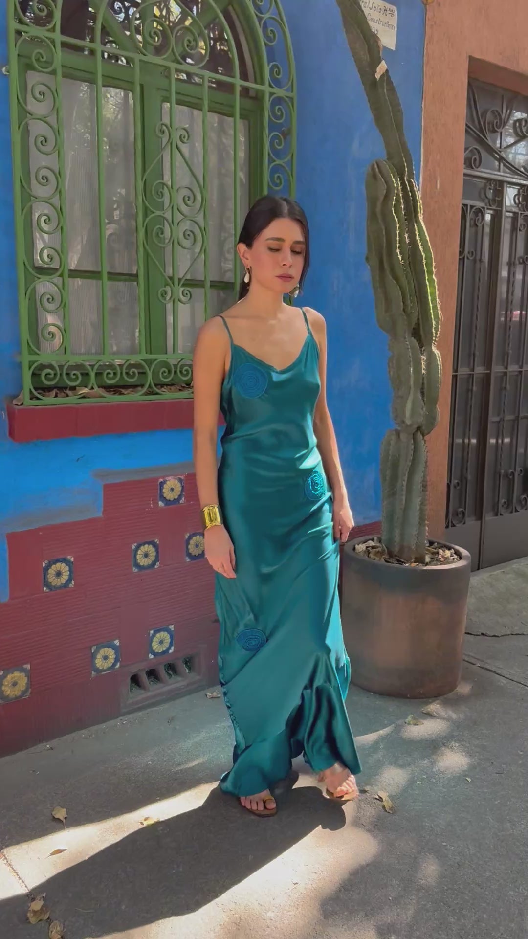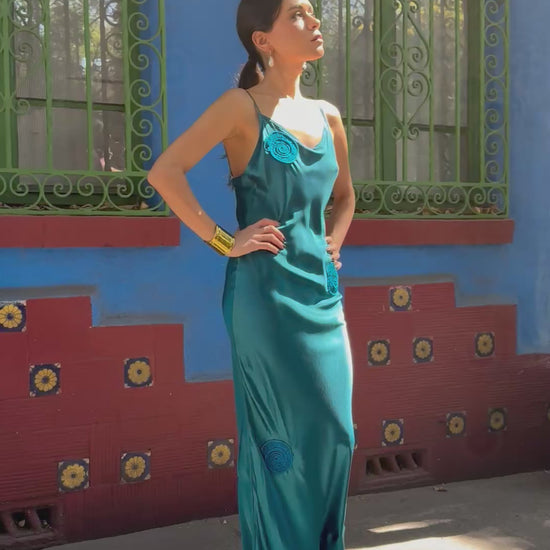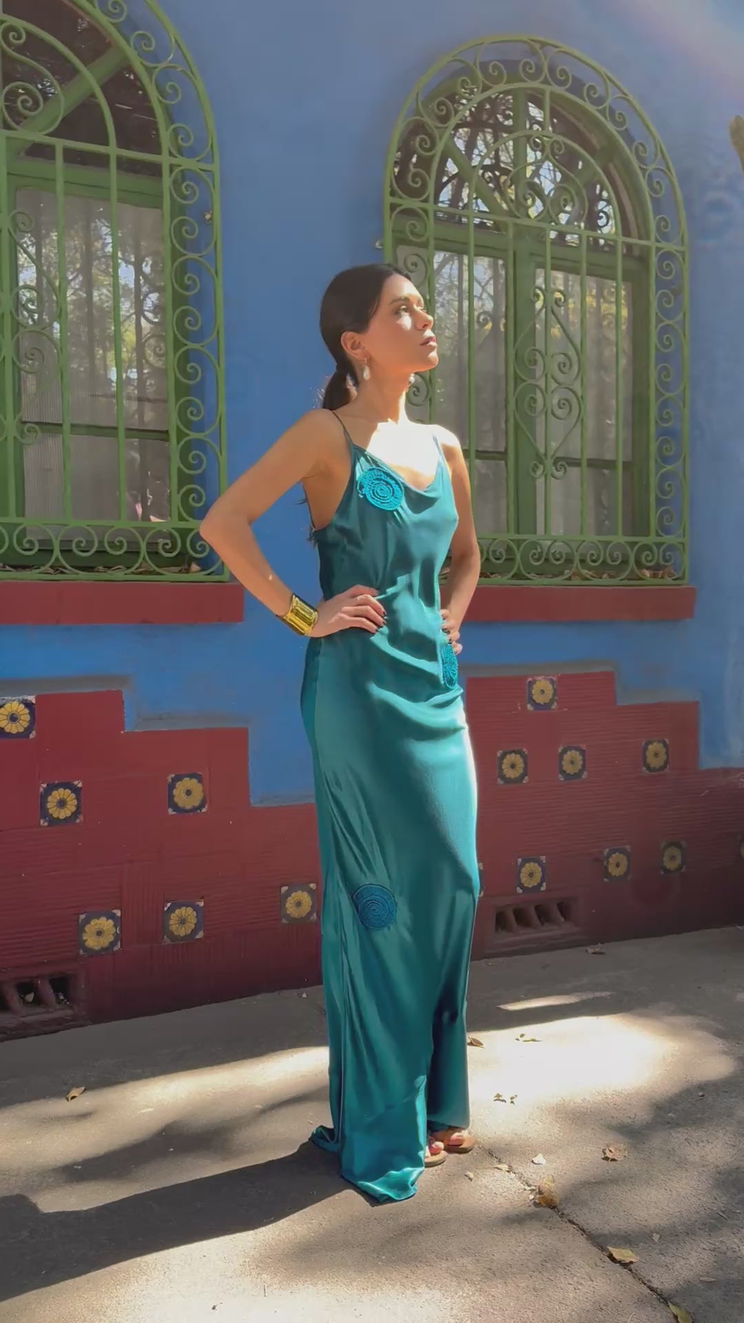 The Aurelia Dress is a luxury silk charmeuse dress designed with masterful draping that highlights and flatters every curve. Cut on the bias for an effortlessly sleek silhouette, this adjustable-strap evening dress moves beautifully with the body. Hand-crocheted spirals are individually inserted, creating unique handcrafted details that sculpt and enhance your figure. A standout piece for any event, the Aurelia Dress embodies modern elegance and elevated artisan craftsmanship.