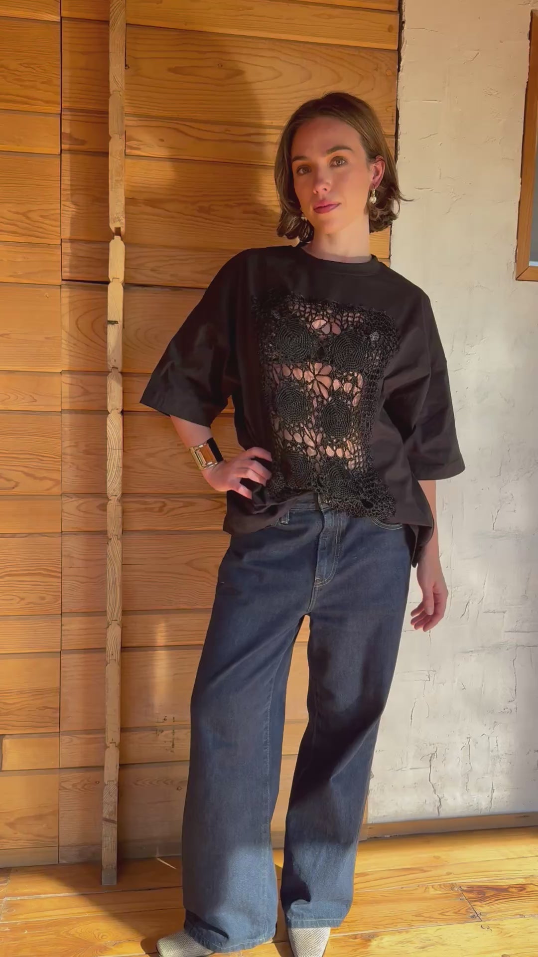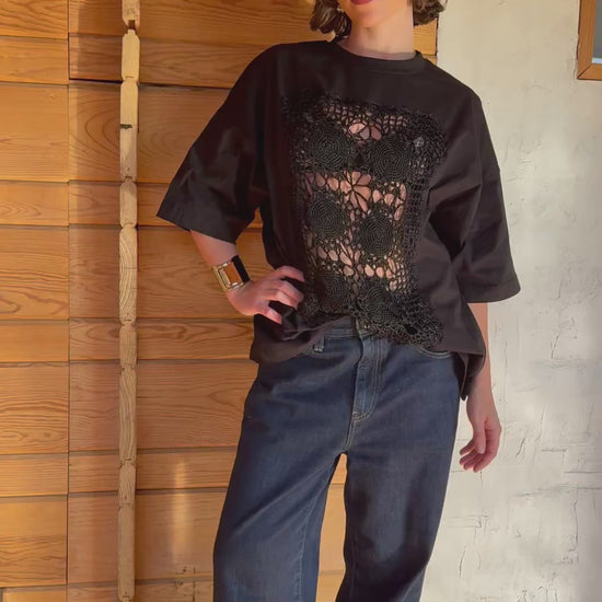 A relaxed, oversized T-shirt featuring a handcrafted crochet panel, cut from premium cotton jersey—an effortlessly chic wardrobe staple.