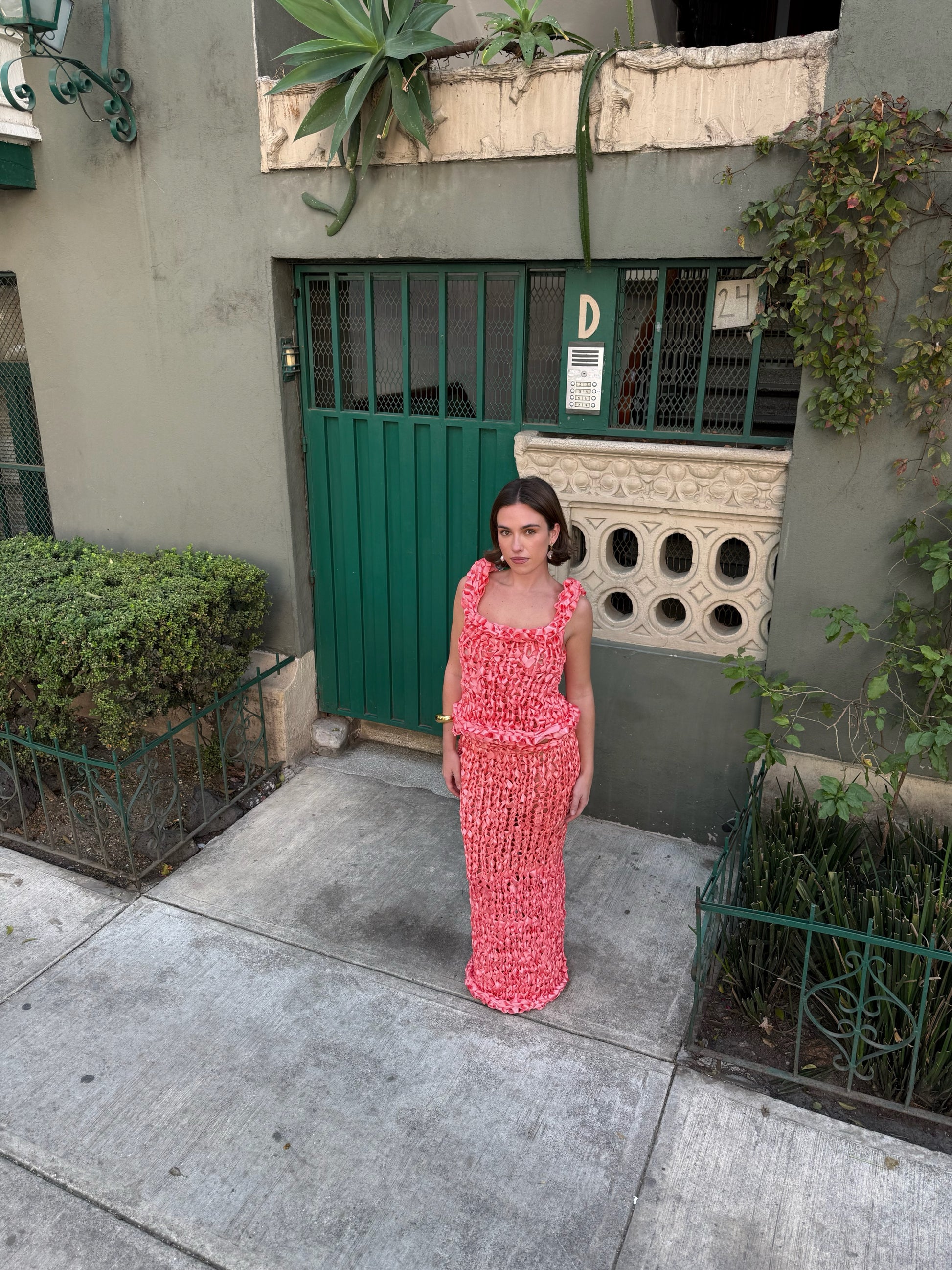 Luxury hand-knitted salmon pink stretchy slip on top made from recycled deadstock ribbons with adjustable straps—perfect for wedding guest outfits or elevated everyday wear.
