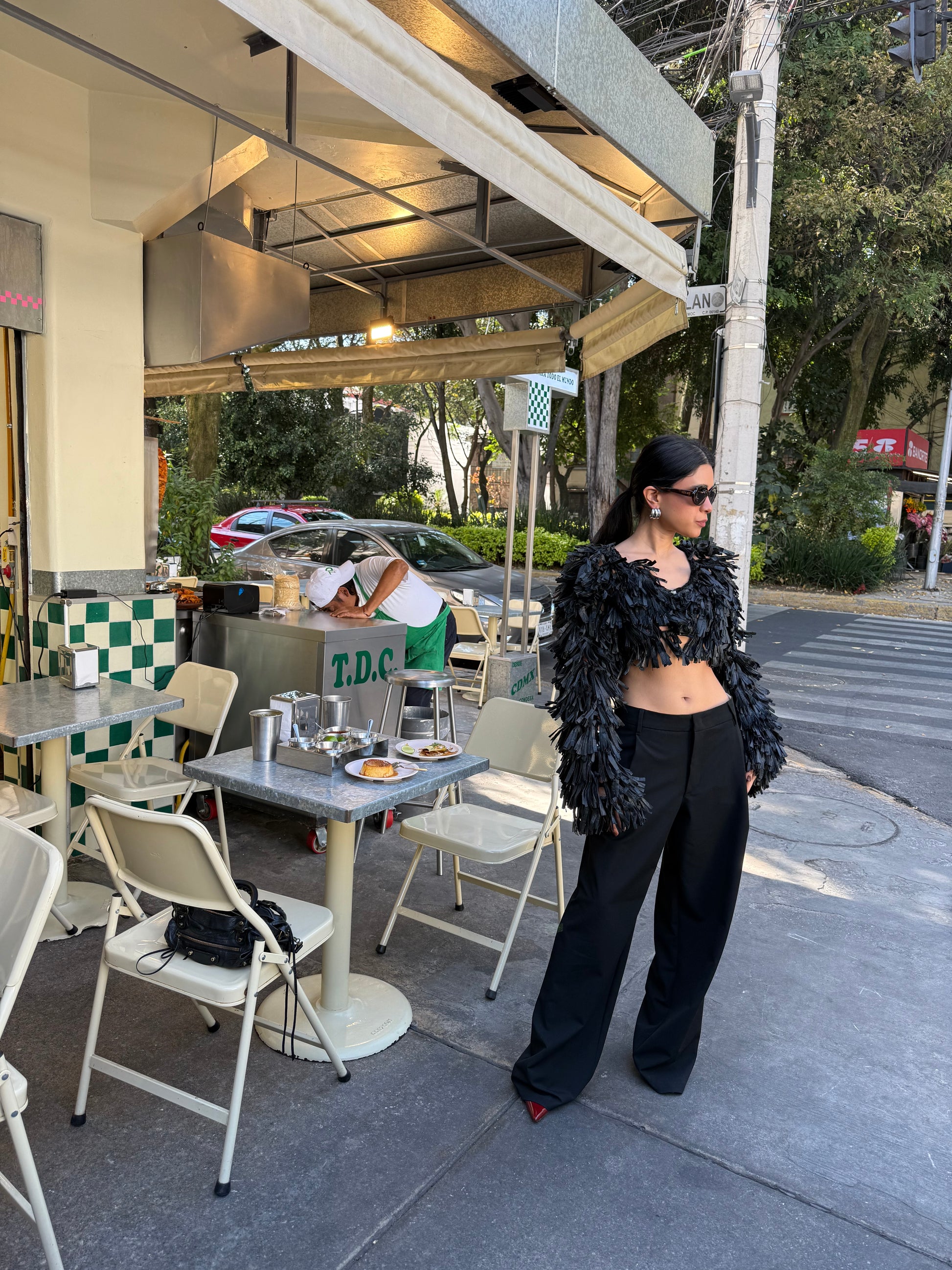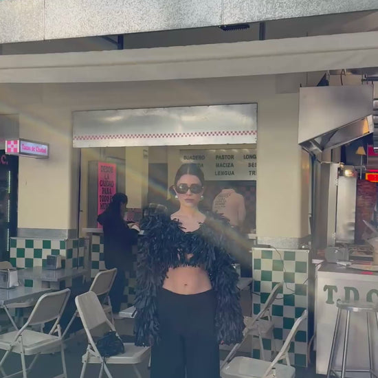 Beautifully constructed with a sexy cropped length, the Raven Bolero Jacket embodies cool girl chic with an edge. This exquisite piece is meticulously handmade from a sumptuous blend of paper raffia and cotton, ensuring a lightweight yet striking silhouette. Pair it with high-waisted trousers or a classic little black dress for an effortless look.