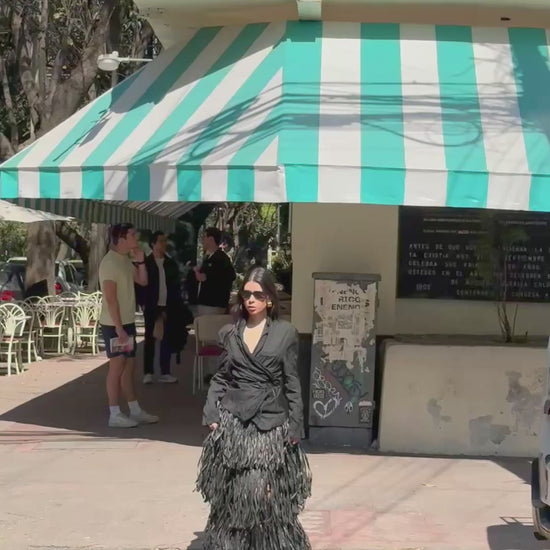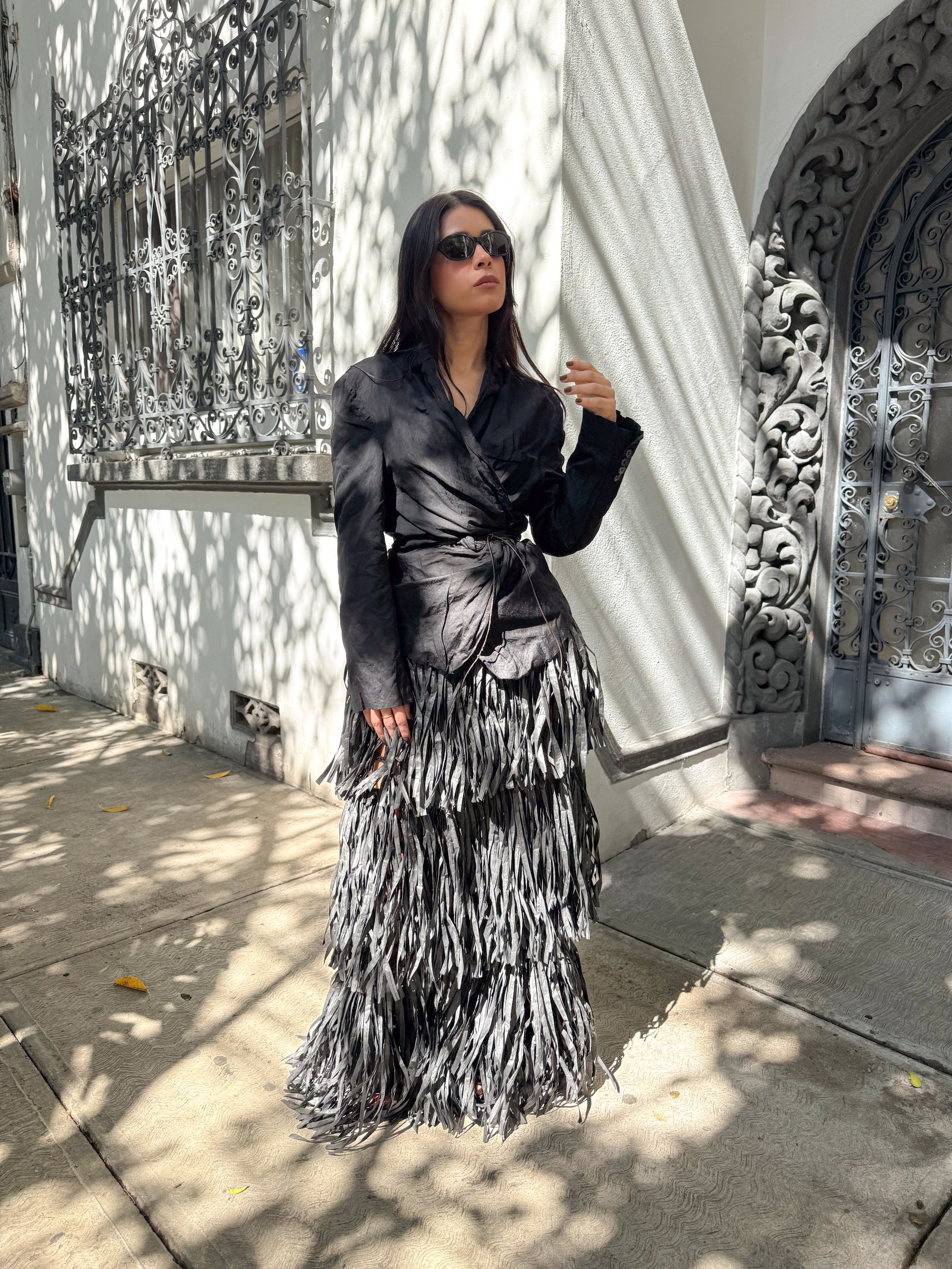 Discover the allure of our Riya Raffia Skirt, a hand-crocheted masterpiece crafted from cotton and paper raffia. This stunning three-tiered silhouette cascades elegantly to the floor, showcasing a chic high waistband that embraces your figure with subtle stretch.