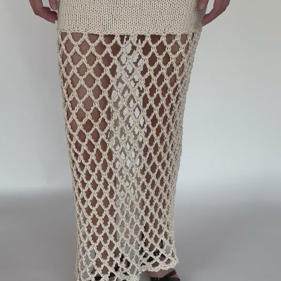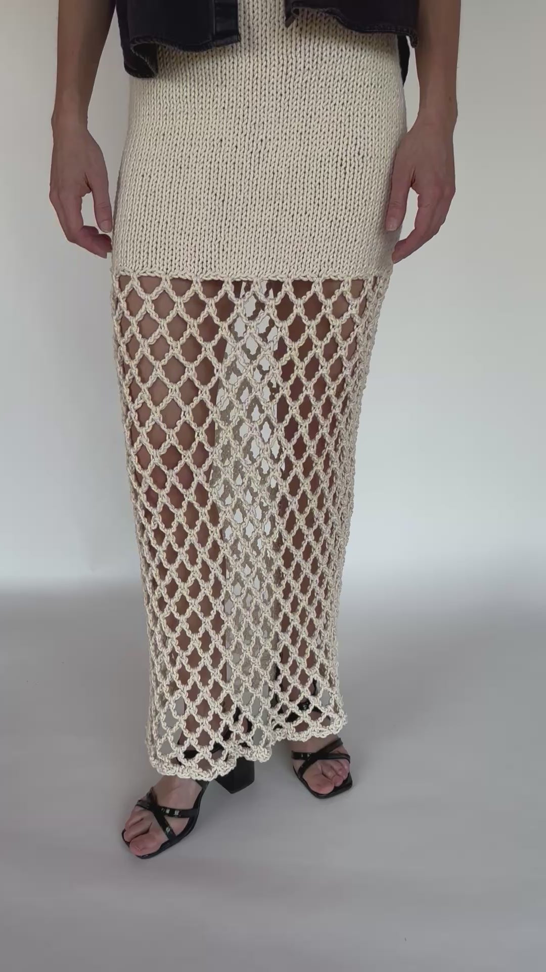 Hand crocheted in Peru, slip on style mid weight skirt with elasticized waistband and modest coverage.